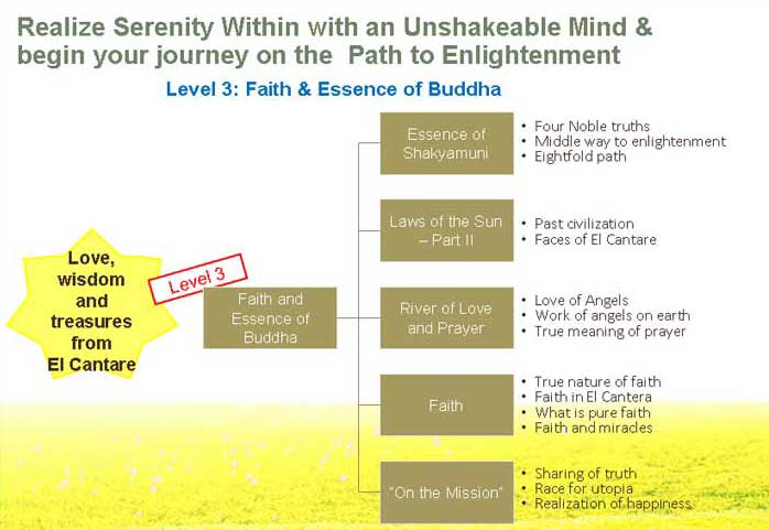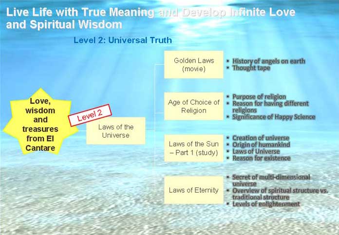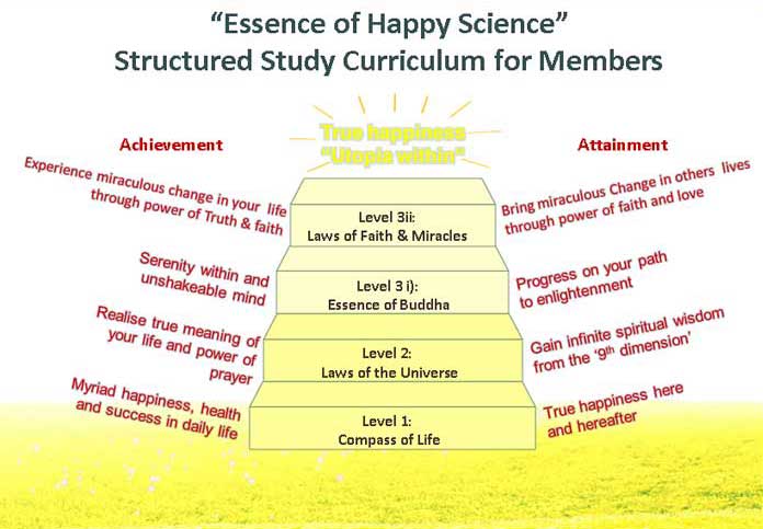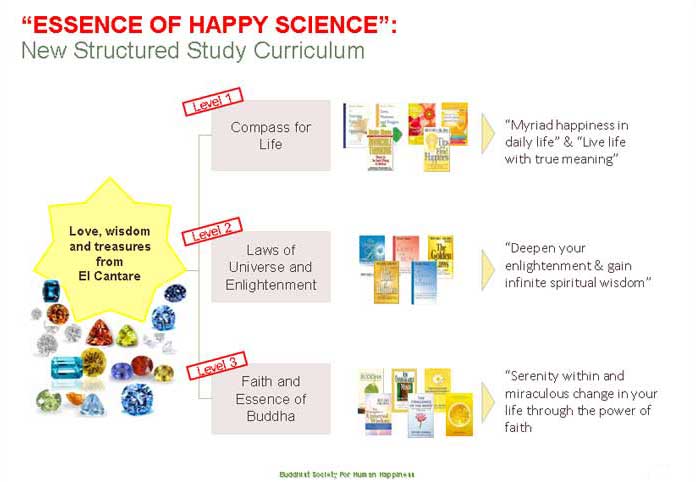 OUR STUDY CURRICULUM | CORE TEACHINGS To help our members find Happiness, Serenity Within and deepen their faith and enlightenment we have a structured 6 month study curriculum "Essence of Happy Science" conducted in 3 levels. This is a wonderful way for our friendship members to gain a bird’s eye overview to the entire breadth and depth of Happy Science teachings that will become an invaluable guide in their daily lives. This new special study curriculum will allow you to acquire knowledge and develop wisdom to lead a happier, healthier and more successful life for you and your family. In addition we hope that through this course you will also progress in your journey towards deeper faith, wisdom and enlightenment and attain true serenity within. A new programme to train leader members to become lay lecturers will also begin in 2010. This course will be structured in three levels with an exam and certificate awarded at the end of each level. Level 1 focuses on mastery of basic truth, level 2 will develop skills to use the Truth to solve your own problems and level 3 will enable you to apply the Truth to help others solve their problems.